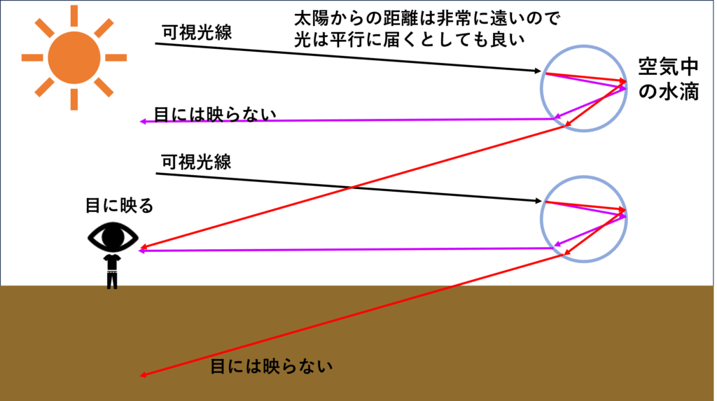 太陽の光が水滴から反射して目に届く角度は、だいたい42度(赤い光の場合)になるように決まっています。