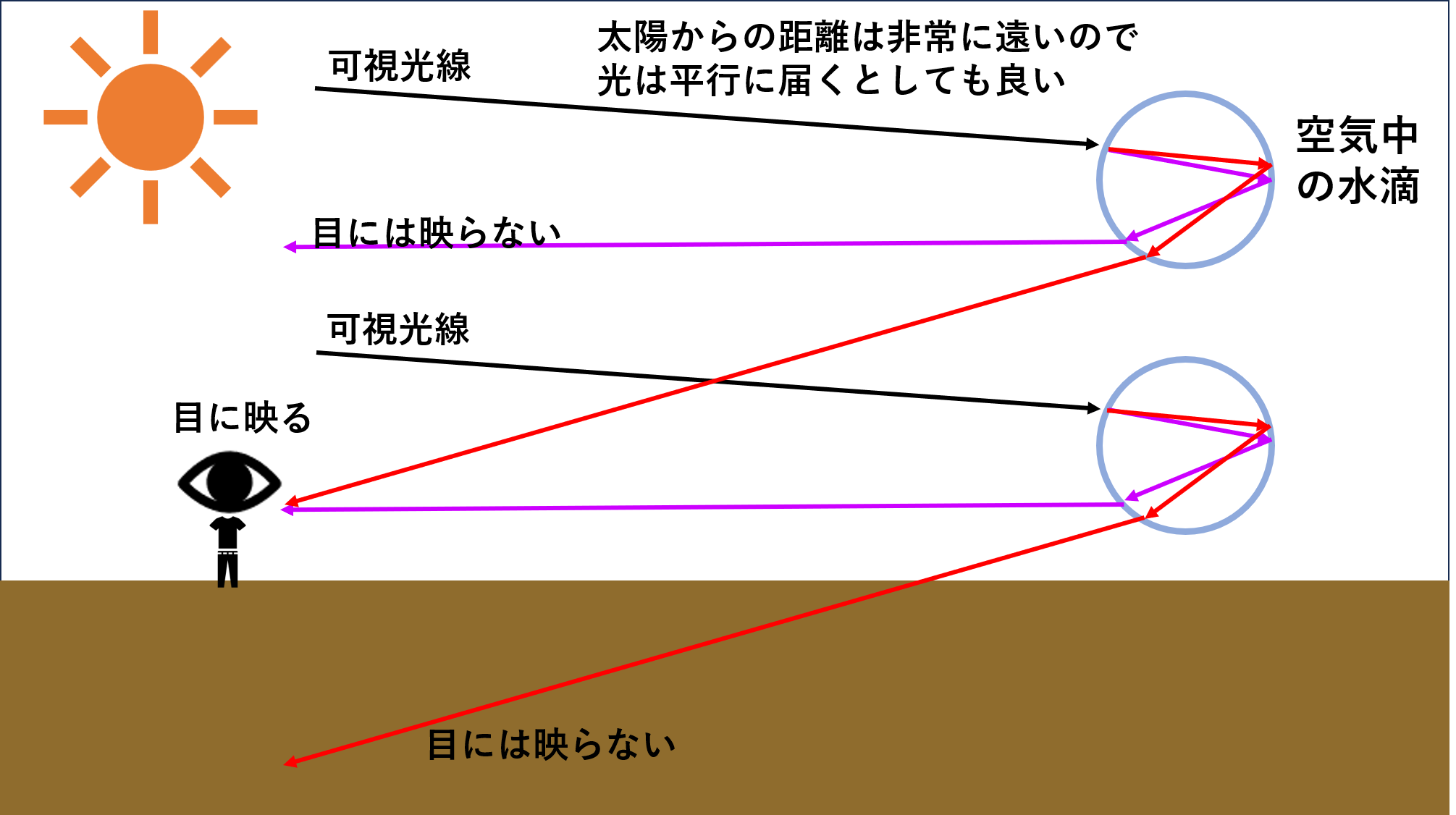 - 虹は、太陽の光が雨粒に入って反射・屈折・分散することでできる