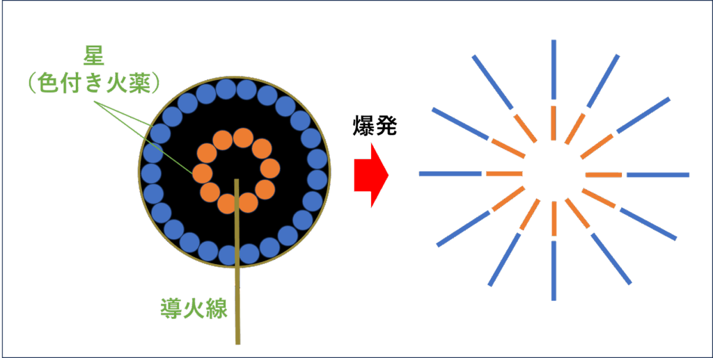 花火が高く上がると、内部の導火線が火を伝え、中心の割薬が爆発。これにより、周囲の星が放射状に飛び散ります。
